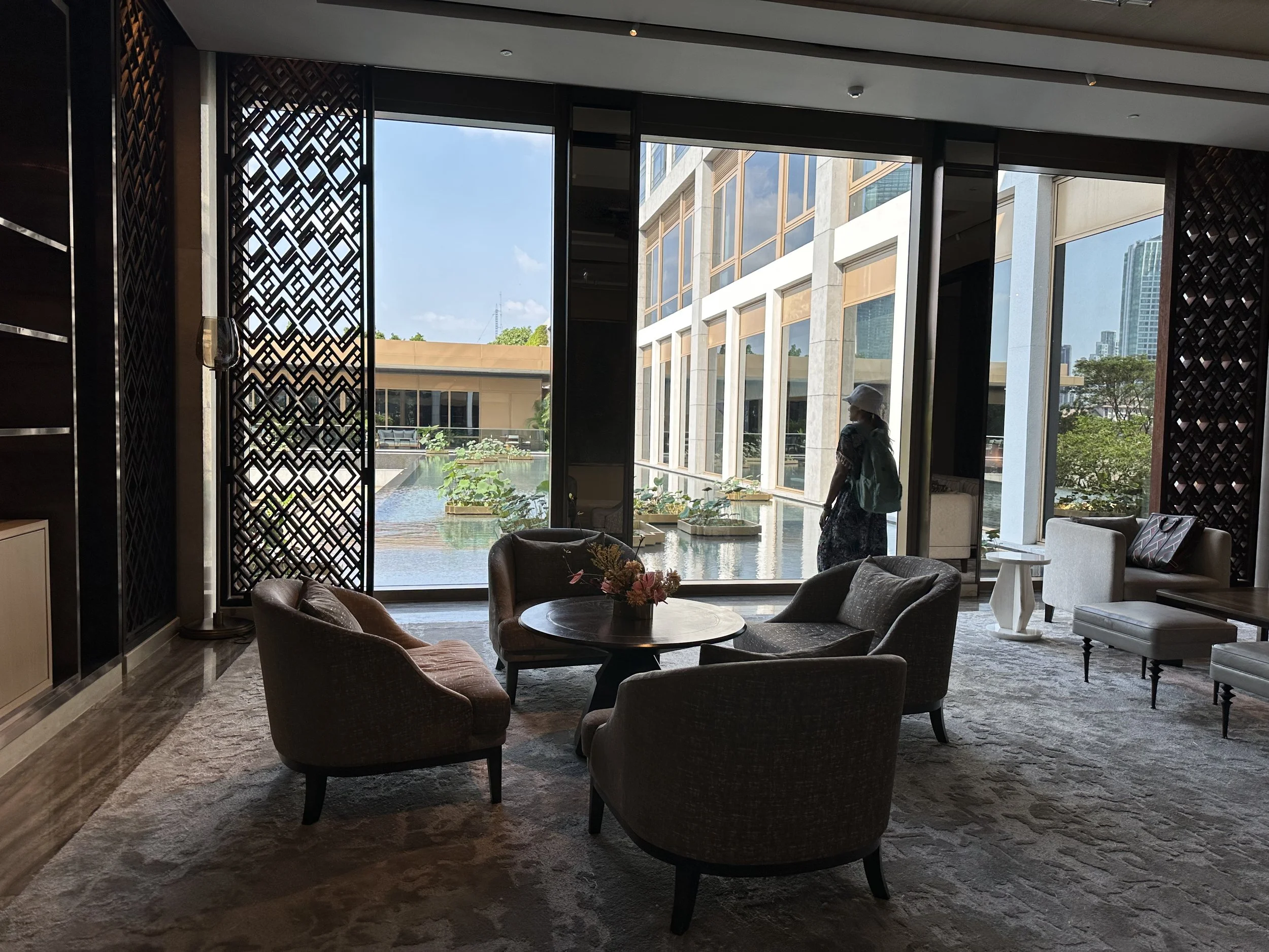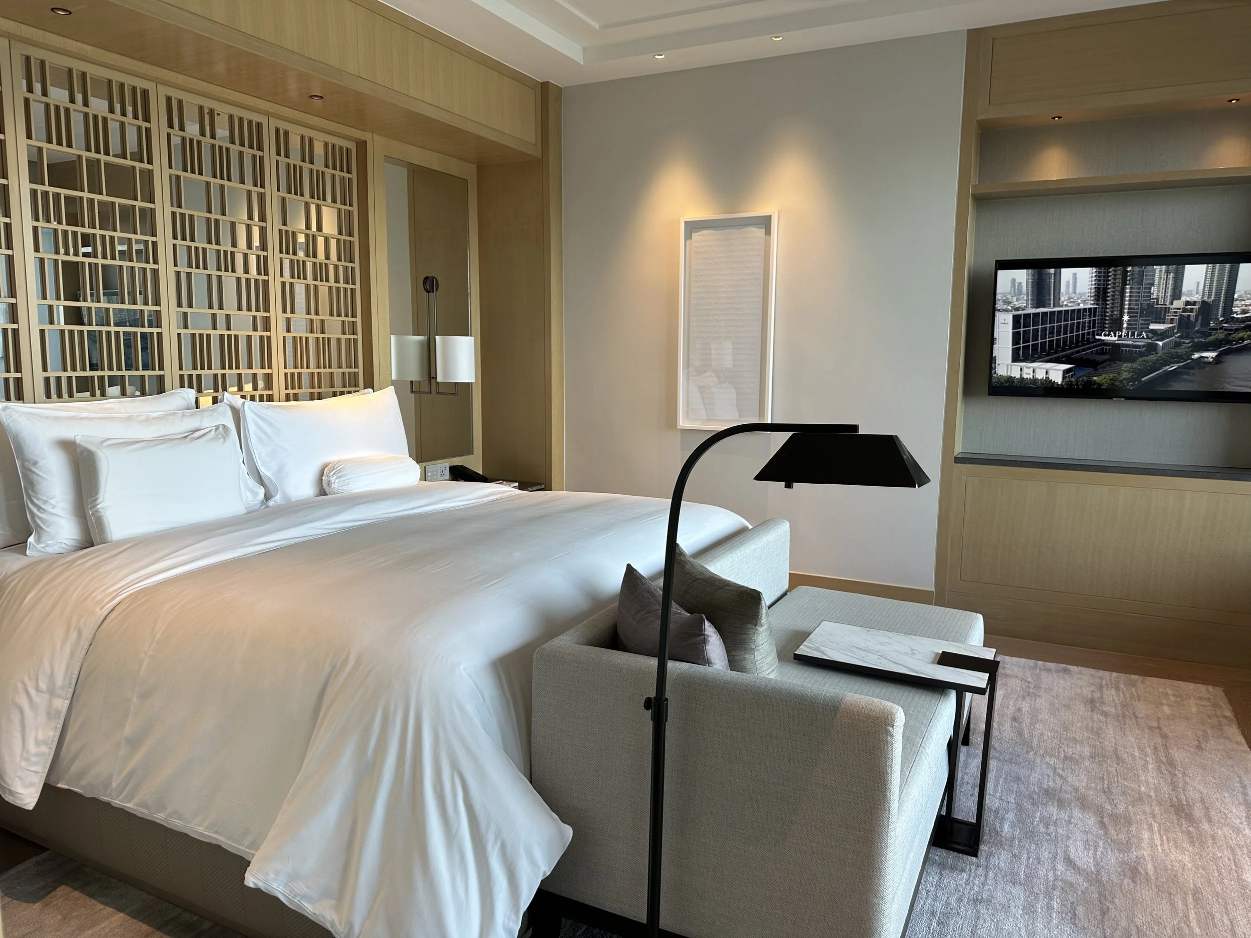 Capella Bangkok feels like a gently kept secret along the Chao Phraya River. Intimate in scale, wrapped in warm Thai hospitality. Fresh coconuts in the morning, a beautifully curated Thai–Japanese–Western breakfast (Jenny has tried her way through the entire menu), staff and concierges who remember our names, thoughtful evening gifts, handwritten notes from housekeeping, and rooms filled with natural light all shape the experience.